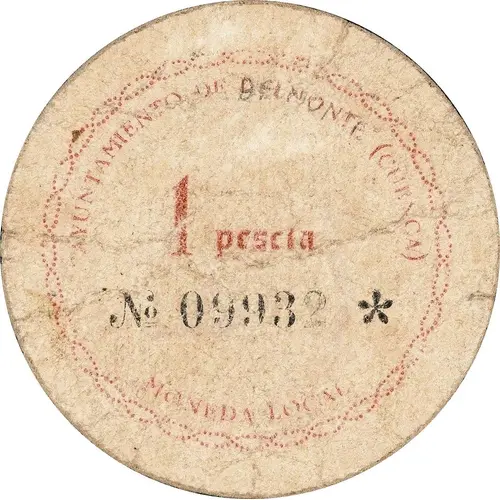 Artistry: As a utilitarian wartime issue, the 1 Peseta Belmonte typically lacks a named engraver or adherence to a formal artistic school. The design, printed for practicality, prioritized clarity. The obverse would display the "1 Peseta" denomination and "Municipio de Belmonte" as issuer, often with an unstated year. The reverse might be blank or feature a simple legend, perhaps a local emblem. Its aesthetic reflects the exigencies of rapid, cost-effective production rather than elaborate artistic intent.