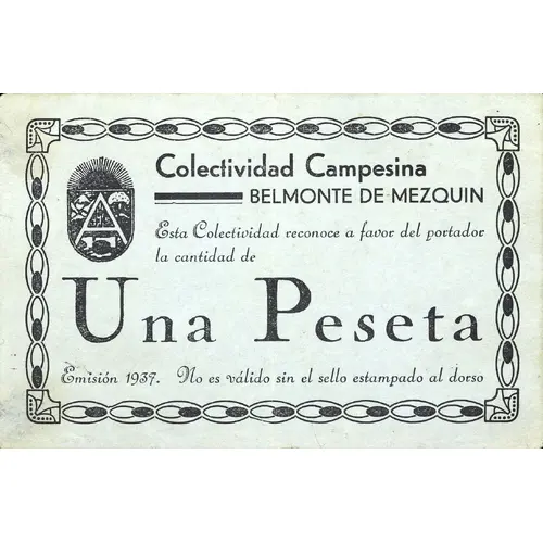 (Translation: Peasant Collectivity Belmonte de Mezquin This Collectivity recognizes in favor of the bearer the amount of One Peseta Issue 1937. Not valid without the stamp stamped on the back.)
