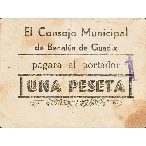 El Consejo Municipal de Benalúa de Guadix pagará al portador UNA PESETA (Translation: The Municipal Council of Benalúa de Guadix will pay the bearer One Peseta) |