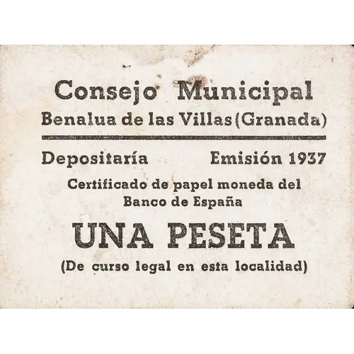 | Obverse lettering | Consejo Municipal Benalúa de las Villas (Granada) Depositaría Emisión 1937 Certificado de papel moneda del Banco de España UNA PESETA (De curso legal en esta localidad) (Translation: Municipal Council Benalúa de las Villas (Granada) Depositary Issue 1937 Bank of Spain paper money certificate One Peseta (Legal tender in this location)) |