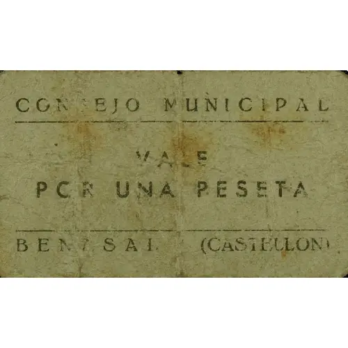 Obverse lettering CONSEJO MUNICIPAL VALE POR UNA PESETA BENASAL (CASTELLON)