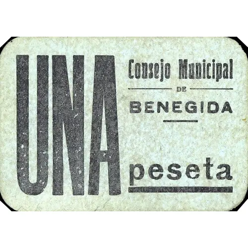 UNA peseta Consejo Municipal DE BENEGIDA (Translation: One Peseta Municipal Council of Benegida) |