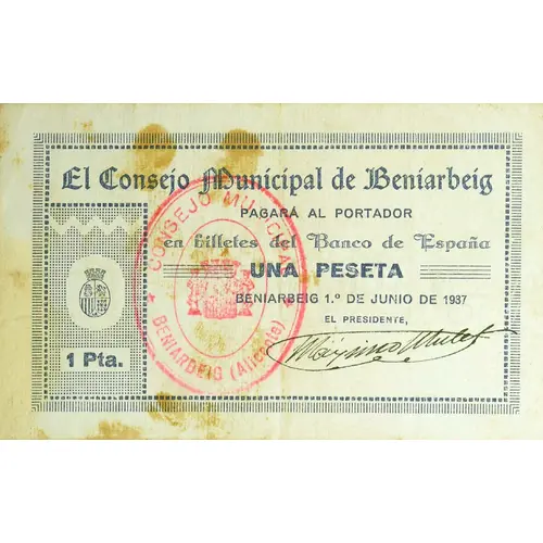 El Consejo Municipal de Beniarbeig PAGARÁ AL PORTADOR en billetes del Banco de España UNA PESETA BENIARBEIG 1.º DE JUNIO DE 1937 1 Pta. (Translation: The Municipal Council of Beniarbeig Will pay the bearer in banknotes of the Bank of Spain One Peseta Beniarbeig, June 1, 1937 1 Peseta) |
