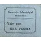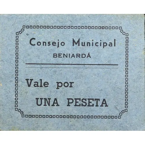Consejo Municipal BENIARDÁ Vale por UNA PESETA (Translation: Municipal Council Beniardá Valid for One Peseta) |