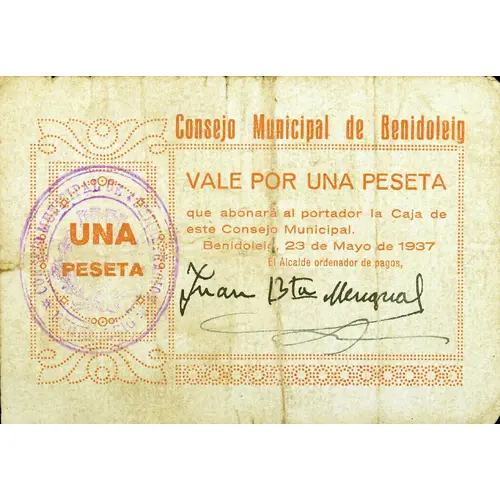 UNA PESETA Consejo Municipal de Benidoleig VALE POR UNA PESETA que abonará al portador la Caja de este Consejo Municipal Benidoleig, 23 de Mayo de 1937 (Translation: One Peseta Municipal Council of Benidoleig It is worth One Peseta which will be paid to the bearer by the Fund of this Municipal Council Benidoleig May 23, 1937) |