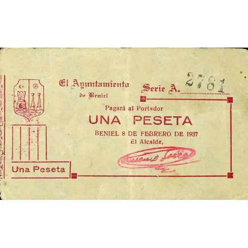 El Ayuntamiento de Beniel Pagará al Portador UNA PESETA BENIEL 8 DE FEBRERO DE 1937 Una Peseta (Translation: The City Council of Beniel Will pay the bearer One Peseta Beniel, February 8, 1937 One Peseta) |