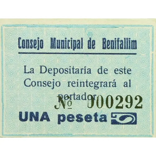 Consejo Municipal de Benifallim La Depositaría de este Consejo reintegrará al portador UNA peseta (Translation: Municipal Council of Benifallim The depository of this Council will reimburse the bearer One Peseta) |