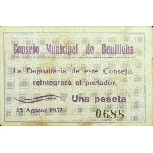 Consejo Municipal de Benilloba La Depositaría de este Consejo reintegrará al portador Una peseta 15 Agosto 1937 (Translation: Municipal Council of Benilloba The Depositary of this Council will reimburse the bearer One Peseta August 15, 1937) |