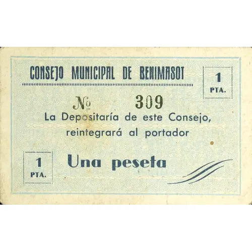 1 PTA. CONSEJO MUNICIPAL DE BENIMASOT La Depositaría de este Consejo, reintegrará al portador Una peseta (Translation: 1 Peseta Municipal Council of Benimasot The depository of this Council, will reimburse the bearer One Peseta) |