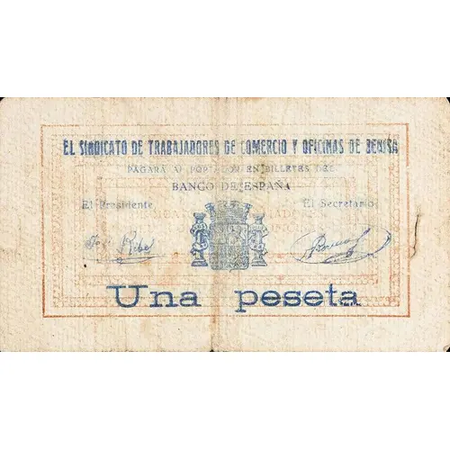 EL SINDICATO DE TRABAJADORES DE COMERCIO Y OFICINAS DE BENISA PAGARÁ AL PORTADOR EN BILLETES DEL BANCO DE ESPAÑA Una peseta (Translation: The Commerce Workers Union and Offices of Benisa Will pay the bearer in banknotes from the Bank of Spain One Peseta) |