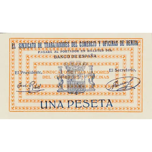 EL SINDICATO DE TRABAJADORES DE COMERCIO Y OFICINAS DE BENISA PAGARÁ AL PORTADOR EN BILLETES DEL BANCO DE ESPAÑA UNA PESETA (Translation: The Commerce Workers Union and Offices of Benisa Will pay the bearer in banknotes from the Bank of Spain One Peseta) |