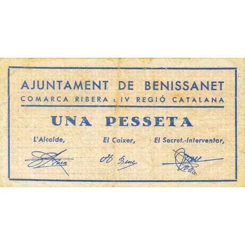 CONSELL MUNICIPAL DE BENISSANET UNA PESSETA Bitllet de circulació obligatòria a tota la jurisdicció municipal. Emissió segons acord del 31 juliol 1937 (Translation: Municipal Council of Benissanet One Peseta Mandatory circulation banknote throughout the municipal jurisdiction. Issue under agreement of July 31, 1937) |