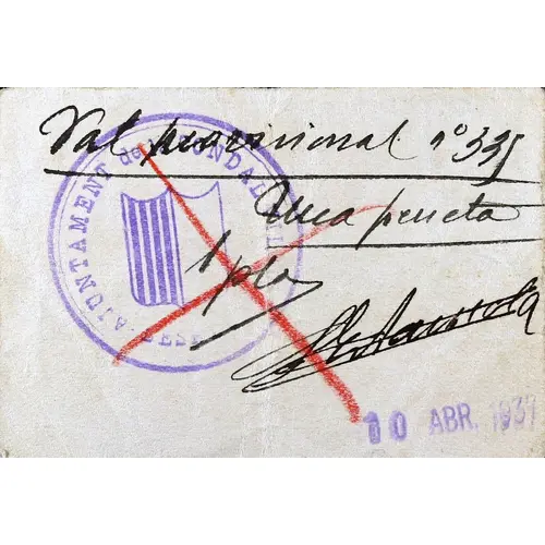 AJUNTAMENT DE LA CONDAL VILA DE BESALU Val provisional nº 335 Una pesseta 1 pta (Translation: City Council of the `condal` town of Besalú Provisional voucher number 335 One Peseta 1 Peseta) |