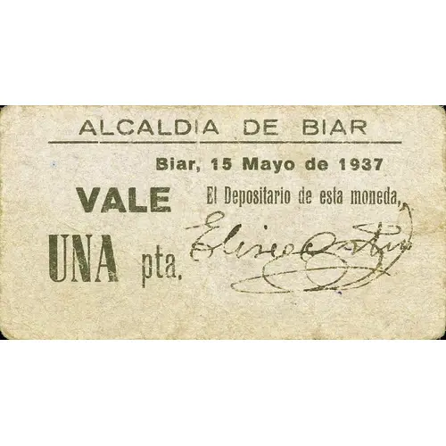(Translation: Mayoralty of Biar Biar, May 15, 1937 Voucher One Peseta The Depositary of this currency,)