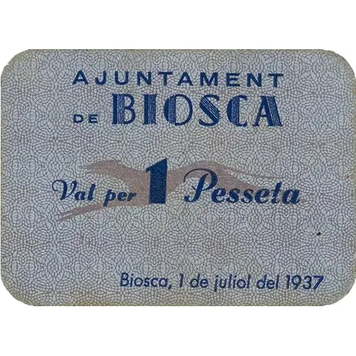 (Translation: City Council of Biosca Valid for 1 Peseta Biosca, July 1, 1937)