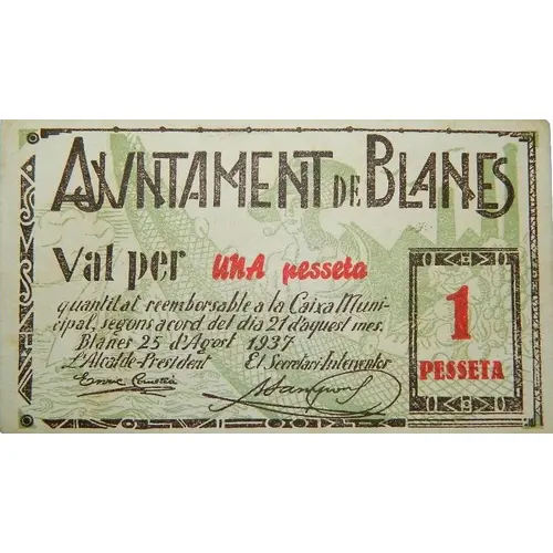 AJUNTAMENT DE BLANES Val per una pesseta quantitat reemborsable a la Caixa Municipal, segons acord del dia 21 d`aquest mes. Blanes 25 d`Agost 1937 1 PESSETA (Translation: City Council of Blanes Voucher for One Peseta Reimbursable amount to the Caixa Municipal, according to the agreement of the 21st of this month. Blanes August 25, 1937 1 Peseta) |