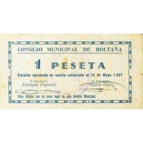 CONSEJO MUNICIPAL DE BOLTAÑA 1 PESETA Emisión aprobada en sesión celebrada el 16 de Mayo 1.937 Estos billetes son de curso legal en este término Municipal. (Translation: Municipal Council of Boltaña 1 Peseta Issue approved in session held on May 16, 1937 These banknotes are legal tender in this Municipal term.) |