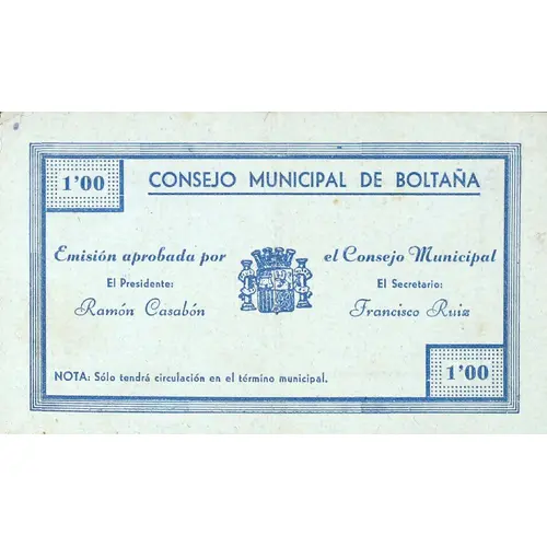 1`00 CONSEJO MUNICIPAL DE BOLTAÑA Emisión aprobada por el Consejo Municipal NOTA: Sólo tendrá circulación en el término municipal. (Translation: Municipal Council of Boltaña Issue approved by the Municipal Council NOTE: It will only have circulation in the municipal term.) |