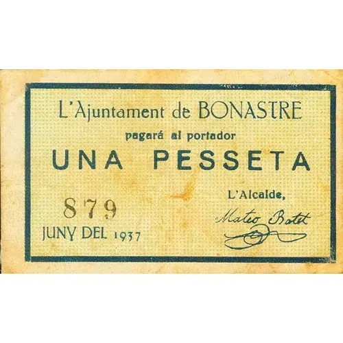 L`Ajuntament de BONASTRE pagará al portador UNA PESSETA JUNY DEL 1937 (Translation: The City Council of Bonastre Will pay the bearer One Peseta June 1937) |