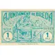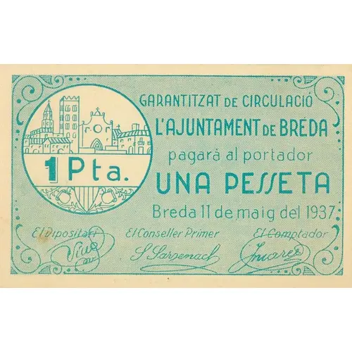 1 Pta. GARANTITZAT DE CIRCULACIÓ L`AJUNTAMENT DE BREDA pagarà al portador UNA PESSETA Breda 11 de maig del 1937 (Translation: 1 Peseta Guaranteed circulation The City Council of Breda will pay the bearer One Peseta Breda May 11, 1937) |