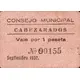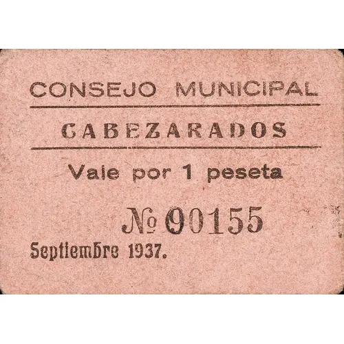 (Translation: Municipal Council Cabezarados Valid for 1 Peseta September 1937.)