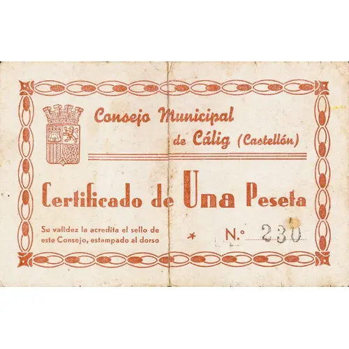 Consejo Municipal de Cálig (Castellón) Certificado de Una Peseta Su validez la acredita el sello de este Consejo, estampado al dorso (Translation: Municipal Council of Cálig (Castellón) One Peseta certificate Its validity is accredited by the seal of this Council, stamped on the back.) |