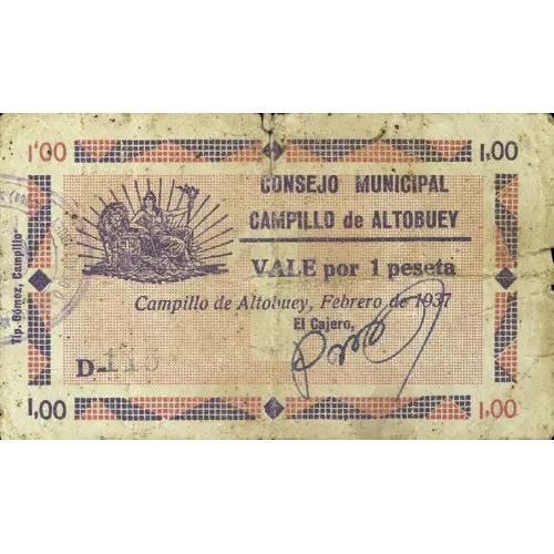 1`00 CONSEJO MUNICIPAL CAMPILLO de ALTOBUEY VALE por 1 peseta Campillo de Altobuey, Febrero de 1937 (Translation: Municipal Council Campillo de Altobuey Voucher for 1 Peseta Campillo de Altobuey, February 1937) |