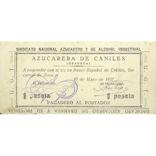 U. G. T. SINDICATO NACIONAL AZUCARERO Y DE ALCOHOL INDUSTRIAL AZUCARERA DE CANILES (GRANADA) A responder con n/ c/c en Banco Español de Crédito, Sucursal de Baza. 10 de Mayo de 1937 1 peseta PAGADERO AL PORTADOR SINDICATO AZUCARERO DE GRANADA Y SU PROVINCIA (Translation: General Union of Workers National Sugar and Industrial Alcohol Union Sugar Factory of Caniles (Granada) To respond with our checking account at Banco Español de Crédito, Baza Branch. May 10, 1937 1 Peseta Payable to bearer Sugar Union of Granada and its province) |