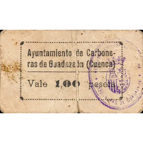 | Obverse lettering | Ayuntamiento de Carboneras de Guadazaón (Cuenca) Vale 1,00 peseta (Translation: City Council of Carboneras de Guadazaón (Cuenca) It`s worth 1.00 Peseta) |