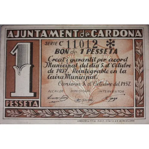 1 PESSETA AJUNTAMENT de CARDONA BON de 1 PESSETA Creat i garantit per acord Municipal del dia 5 d`Octubre de 1937. Reintegrable en la Caixa Municipal. Cardona 5 d`Octubre del 1937. (Translation: 1 Peseta City Council of Cardona Bond of 1 Peseta Created and guaranteed by Municipal agreement of October 5, 1937. Refundable at the `Caixa Municipal`. Cardona October 5, 1937.) |