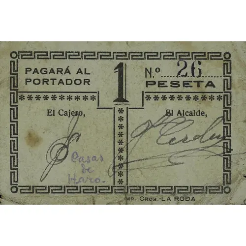 PAGARÁ AL PORTADOR 1 PESETA IMP. CROS · LA RODA (Translation: Will pay the bearer 1 Peseta) |