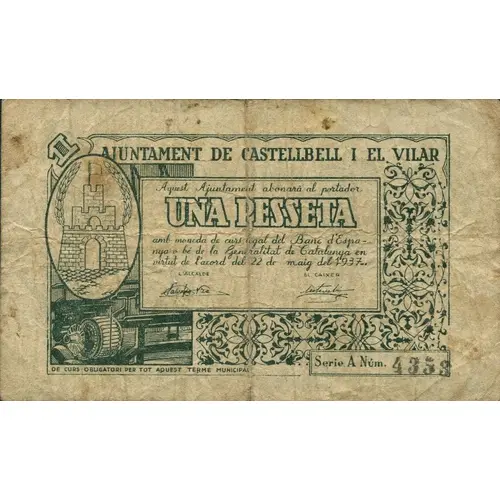 1 AJUNTAMENT DE CASTELLBELL I EL VILAR Aquest Ajuntament abonará al portador UNA PESSETA amb moneda de curs legal del Banc d`Espanyao bé de la Generalitat de Catalunya en virtut de l`acord del 22 de maig del 1937. DE CURS OBLIGATORI PER TOT AQUEST TERME MUNICIPAL (Translation: City Council of Castellbell i el Vilar This City Council will pay the bearer One Peseta with currency of legal tender of the Bank of Spain or of the Generalitat de Catalunya by virtue of the agreement of May 22, 1937. Of mandatory course for all this Municipal Term) |