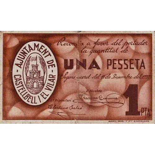 AJUNTAMENT DE CASTELLBELL I EL VILAR Reconeix a favor del portador UNA PESSETA Segons acord del 11 de Desembre del 1937. (Translation: City Council of Castellbell i el Vilar Recognizes in favor of the bearer One Peseta According agreement of December 11, 1937.) |
