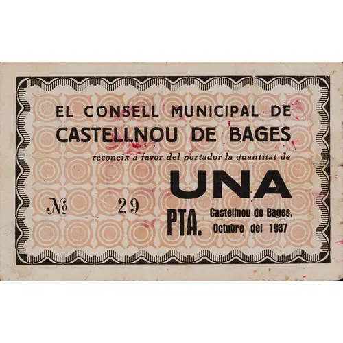 | Obverse lettering | EL CONSELL MUNICIPAL DE CASTELLNOU DE BAGES reconeix a favor del portador la quantitat de UNA PTA. Castellnou de Bages, Octubre del 1937 (Translation: The Municipal Council of Castellnou de Bages recognizes in favor of the bearer the amount of One Peseta Castellnou de Bages, October 1937) |