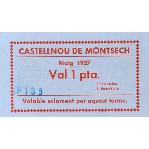 CASTELLNOU DE MONTSECH Maig 1937 Val 1 pta. Valable solament per aquest terme. (Translation: Castellnou de Montsech May 1937 Voucher 1 Peseta Valid only in this term.) |