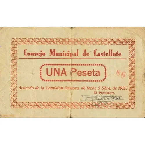 Consejo Municipal de Castellote UNA Peseta Acuerdo de la Comisión Gestora de fecha 5 Sbre. de 1937. El Presidente, (Translation: Municipal Council of Castellote One Peseta Agreement of the Managing Commission dated September 5, 1937. The President,) |