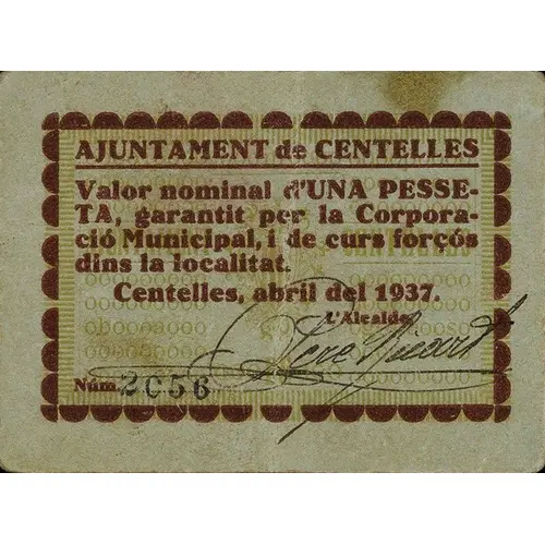 AJUNTAMENT de CENTELLES Valor nominal d`UNA PESSETA, garantit per la Corporació Municipal, i de curs forçós dins la localitat. Centelles, abril del 1937. (Translation: City Council of Centelles Nominal value of One Peseta, guaranteed by the Municipal Corporation, and compulsory within the town. Centelles, April 1937.) |