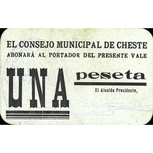 EL CONSEJO MUNICIPAL DE CHESTE ABONARÁ AL PORTADOR DEL PRESENTE VALE UNA peseta (Translation: The Municipal Council of Cheste Will pay to the bearer of this voucher One Peseta) |