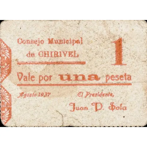 1 Consejo Municipal de CHIRIVEL Vale por una peseta Agosto 1937 (Translation: Municipal Council of Chirivel Valid for One Peseta August 1937) |