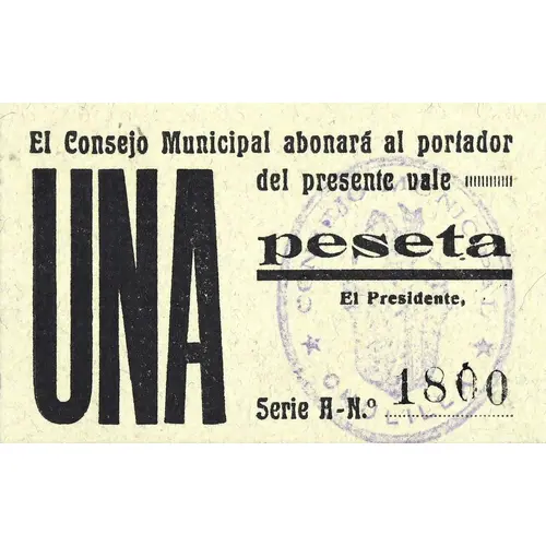 El Consejo Municipal abonará al portador del presente vale UNA peseta (Translation: The Municipal Council will pay to the bearer of this voucher One Peseta) |