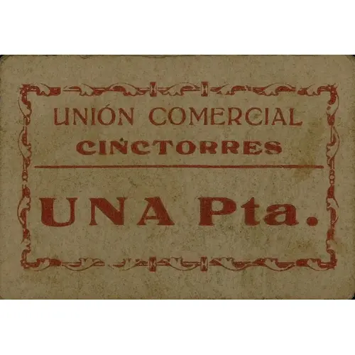 | Obverse lettering | UNIÓN COMERCIAL CINCTORRES UNA Pta. (Translation: Commercial Union Cinctorres One Peseta) |