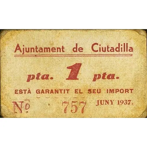 (Translation: City Council of Ciutadilla 1 Peseta Its amount is guaranteed June 1937.)