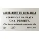 AJUNTAMENT DE CIUTADILLA CERTIFICAT DE PLATA UNA PESSETA d`ús forçós solament en aquesta vila Febrer, 1937 (Translation: City Council of Ciutadilla Silver Certificate One Peseta of mandatory use only in this town February, 1937) |