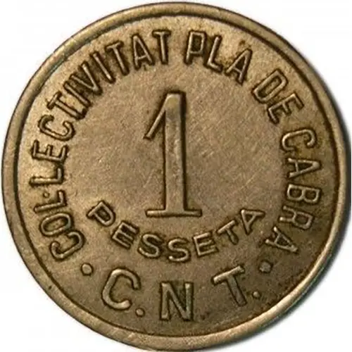 COL·LECTIVITAT PLA DE CABRA · C. N. T. · 1 PESSETA (Translation: Collectivity `Pla de Cabra` 1 Peseta) |