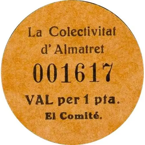 | Legenda del dritto | La Colectivitat d`Almatret 001617 VAL per 1 pta. El Comité. (Translation: The Collectivity of Almatret Voucher for 1 Peseta. The Committee.) |