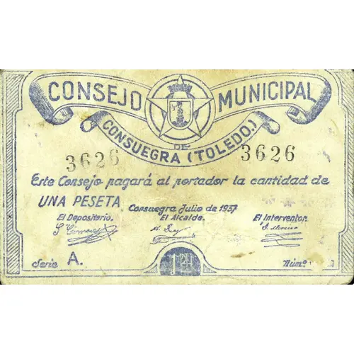 CONSEJO MUNICIPAL DE CONSUEGRA (TOLEDO) Este Consejo pagará al portador la cantidad de UNA PESETA Consuegra Julio de 1937 (Translation: Municipal Council of Consuegra (Toledo) This Council will pay the bearer the amount of One Peseta Consuegra July, 1937) |
