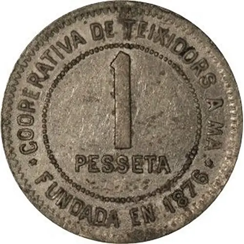 1 PESSETA COOPERATIVA DE TEIXIDORS A MA FUNDADA EN 1876 (Translation: 1 Peseta Hand Knitters Cooperative Founded in 1876) |