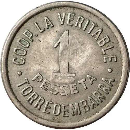 | Надписи аверса | COOP. LA VERITABLE 1 PESSETA · TORREDEMBARRA · (Translation: Cooperative `La Veritabe` 1 Peseta) |