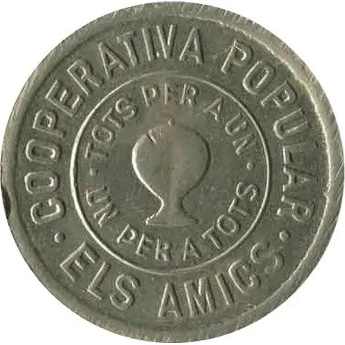 | Obverse lettering | COOPERATIVA POPULAR · ELS AMICS · TOTS PER A UN · UN PER A TOTS · (Translation: Popular Cooperative. The Friends . All for one. One for all) |