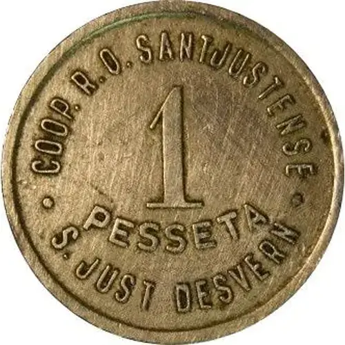 | Obverse lettering | COOP. R. O. SANTJUSTENSE 1 PESSETA · S. JUST DESVERN · (Translation: 1 Peseta) |